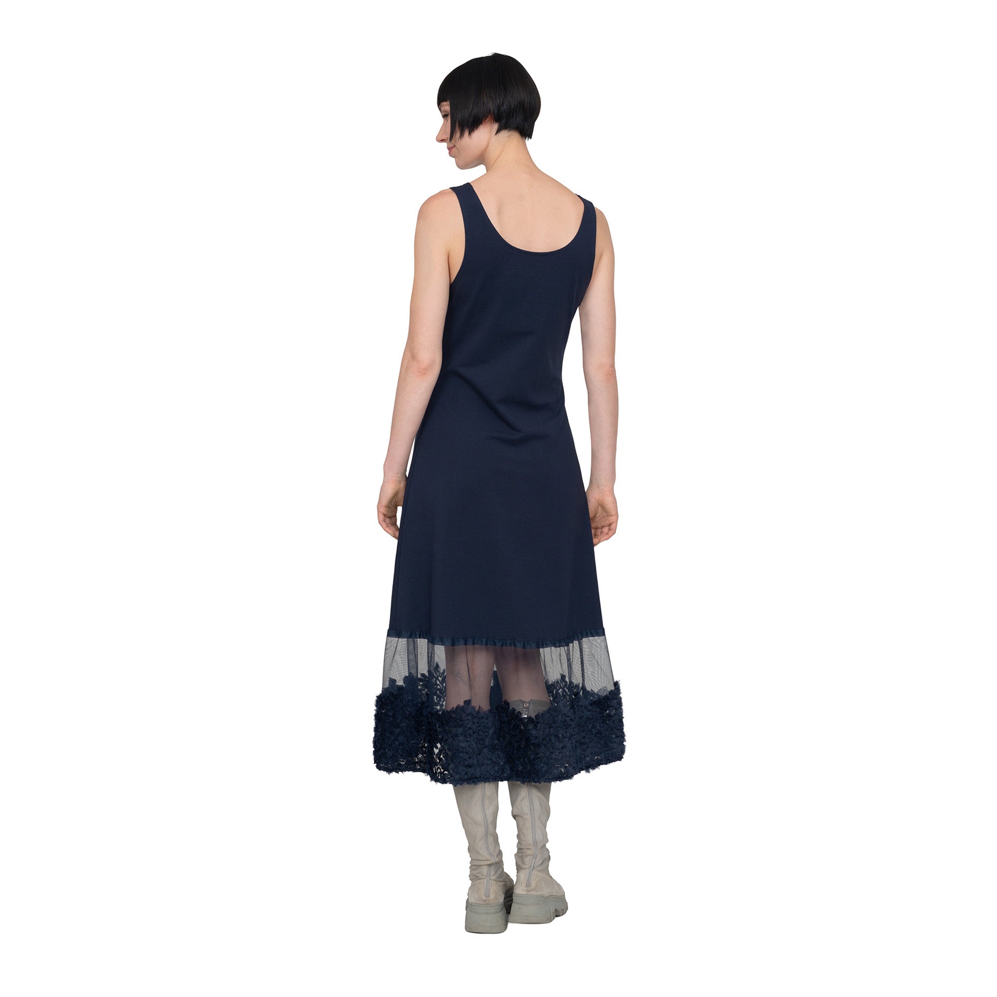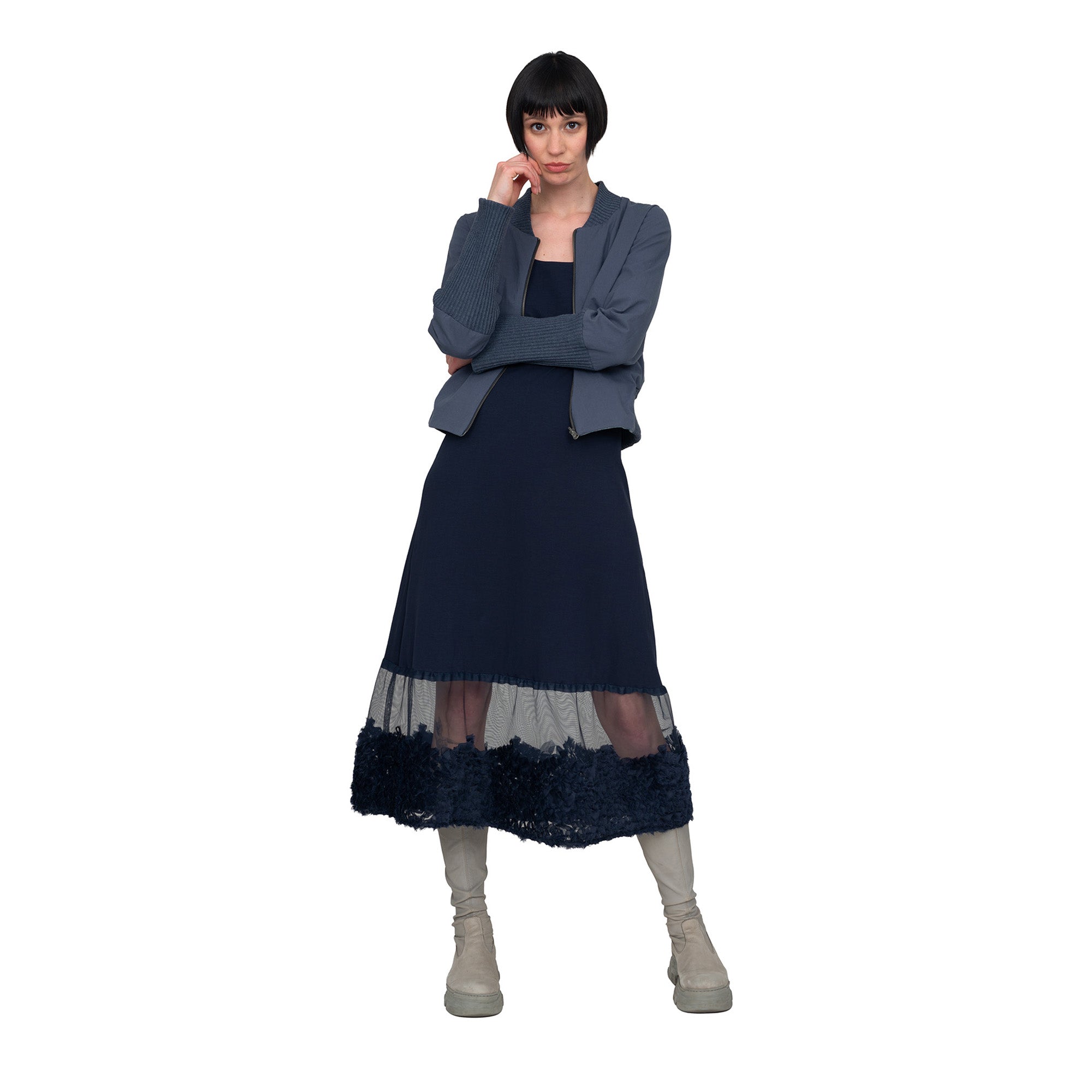 Dieses besondere Jerseykleid erhält durch den angesetzten Tüllsaum mit kunstvoll aufgenähten Tüllmustern eine außergewöhnliche, leicht extravagante Note und macht es zu einem echten Blickfang – ob im Alltag oder zu besonderen Anlässen.