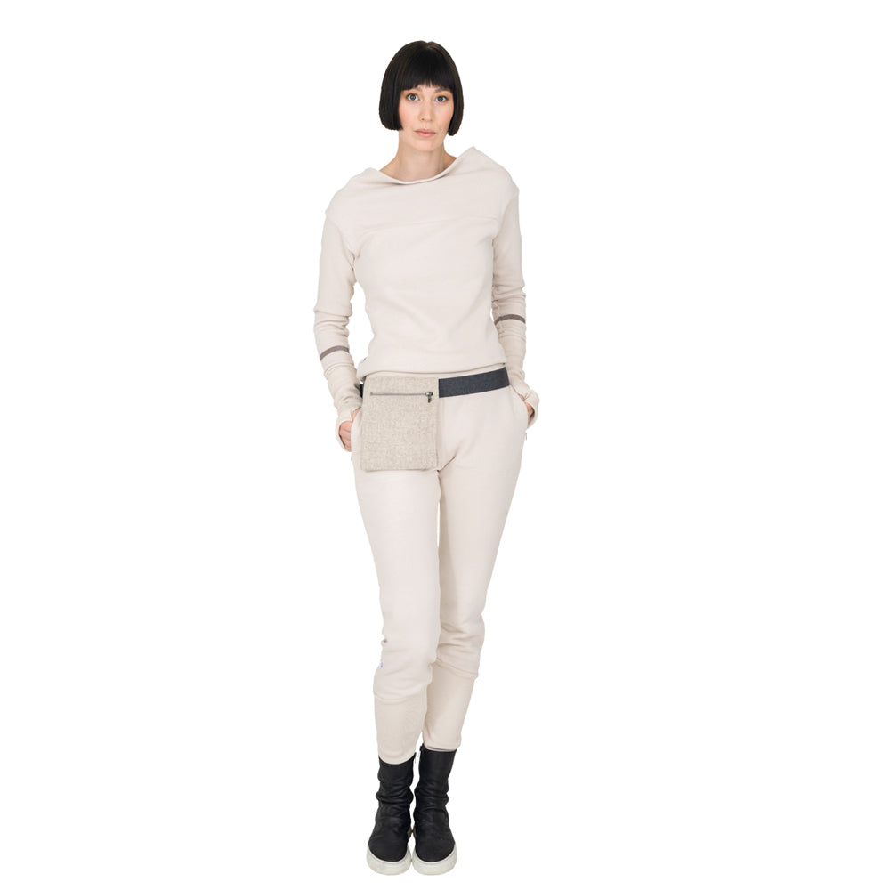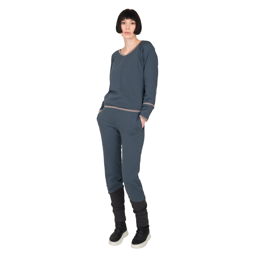 Die Hose lässt sich bequem mit einem breiten Bund aus feinem Rippjersey tragen. Seitlich besitzt sie Eingriffstaschen. Sportlich-elegant der U-Einsatz aus Rippjersey.